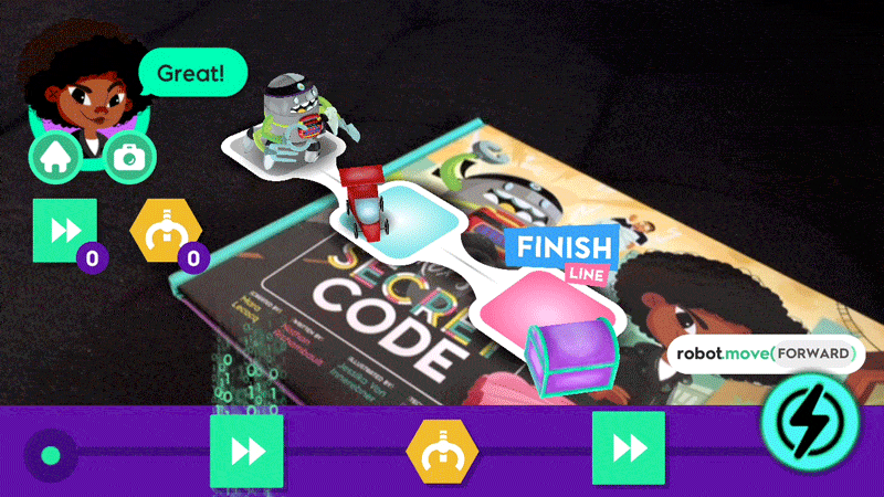 At the end of the book, the story isn't over. The last page drives you to download Rox’s Secret Coding Game, our companion AR app that lets kids design their own robots and learn how to code.